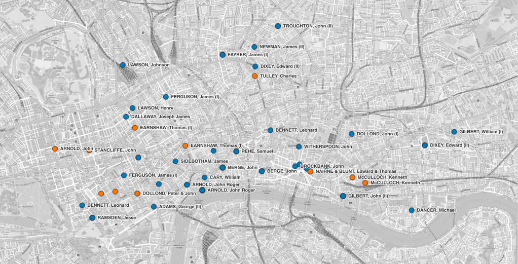 Mapping our observatory-linked makers (orange dots) and their connections (blue dots) using QGIS at street level in London and at town level nationally shows a natural concentration in the instrument trade’s first and subsequently most important location of London. These makers are spread out from the city itself, along the major thoroughfare of Fleet Street and the Stand and into Westminster, very much the geography that has been described by Alexi Baker in her work on the early 18th-century trade. It is interesting to note in the map below, covering the period 1750-1800, that the orange dots are weighted to the west, a reflection of the success and size of these businesses, situated in fashionable Westminster.