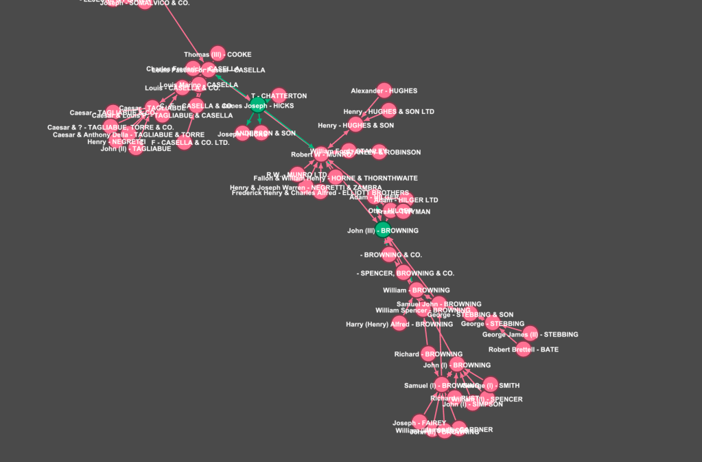 Gephi also threw up a separate but distinct cluster around makers of meteorological instruments. As a specialism this then appears as largely unnetworked with the makers of optical and mathematical instruments that supplied telescopes and instruments with scales (mural quadrants, circles etc). Yet both were key to the work of observatories: meteorological observations are required for adjusting astronomical observations even if an observatory did not have a dedicated meteorological programme. Again, this network includes makers who did supply observatories, but are not currently noted as such in SIMON, and others that may be worth further research.
