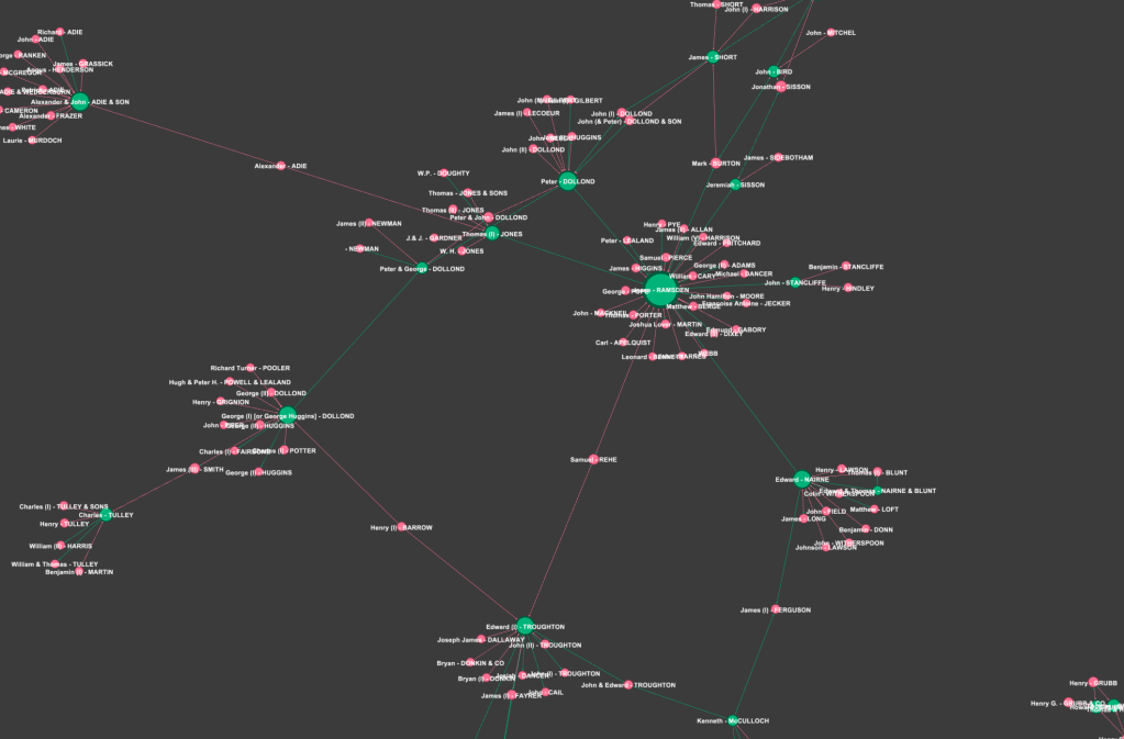 Using the data we do have, Duncan has been able to do some network and geographical visualisations of makers. Supplying observatories, especially those funded by the state or universities, was complex and high-status work, so we would expect this group to be particularly well networked. The graph created through Gephi is suggestive and could be enhanced, if and when an expanded set of makers is available, making comparisons between different observatory networks possible. Even showing relations (business, apprenticeship, family) at just one degree, good (and known) candidates for other observatory-linked makers are thrown up for further scrutiny. It also appears that makers linked and local to one observatory (e.g. Adie & Sons and the Royal Observatory in Edinburgh, at the top left in the image below) have associations that link them to London-based makers who supplied Greenwich (e.g. Thomas Jones, himself closely linked to other important makers of observatory instruments, like Jesse Ramsden and the Dollonds).