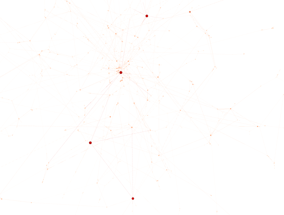 In addition to isolating just this one kind of relationship, here are looking at nodes that are resized to show ‘Eigencentrality’ (proximity to well-connected nodes) and shaded from cold to warm on ‘betweenness centrality’ (how many shortest-paths run through each node).