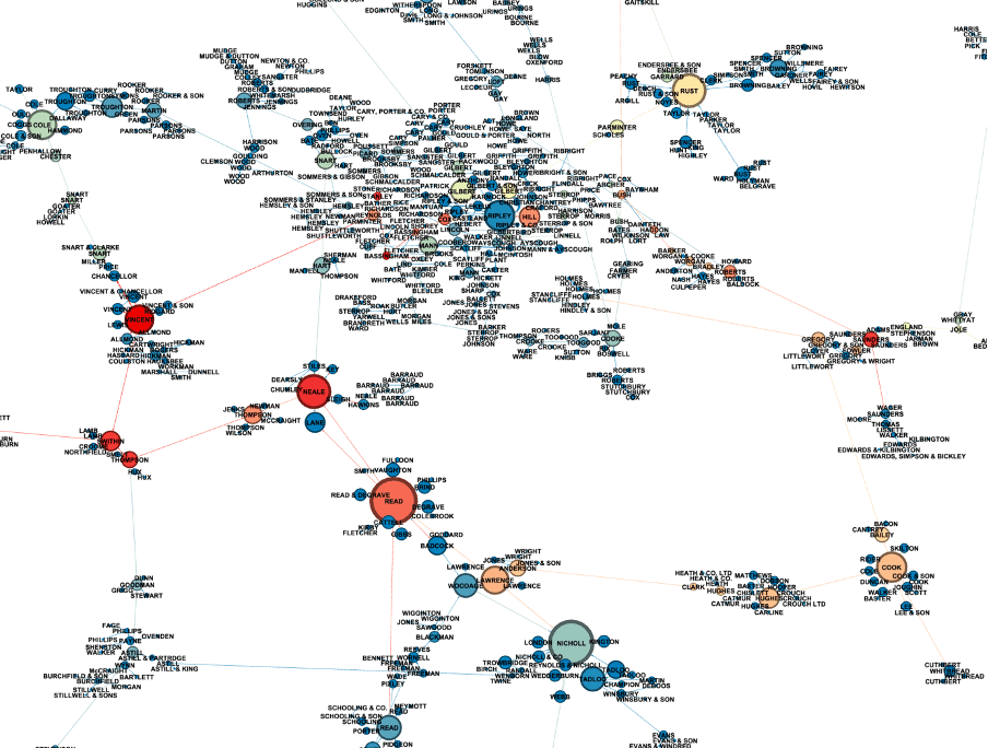 As abstract as it is, I agree with Ruth and Sebastian Ahnert when they say that images like this are powerful: were are ‘seeing’ a vast historical phenomenon, i.e. the entire trade of scientific instrument making in Britain from the early-modern period up to the 20th century. To use an apt metaphor, are using a new tool to glimpse and otherwise unseen world.