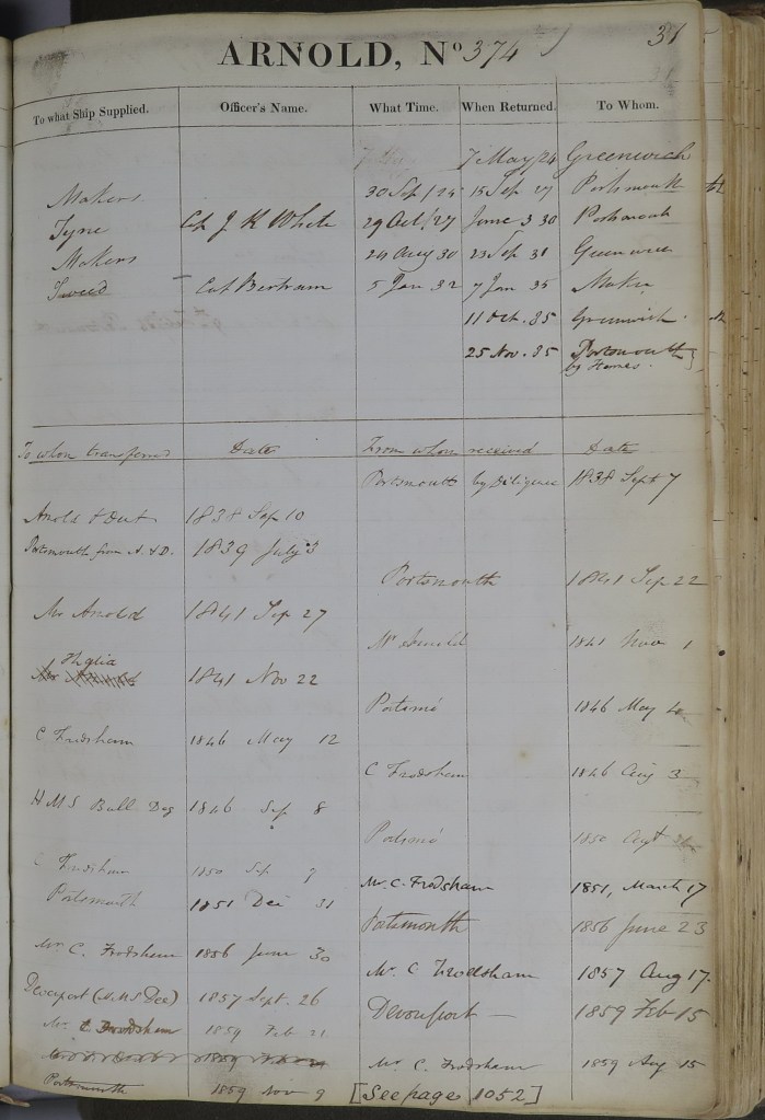 - Chronometer Transfers: To: instances of the Admiralty transferring a chronometer to a person, organisation, or ship; this might involve a return to its maker for repair, to a Naval depot or overseas station, or for use in navigation on a voyage or expedition;