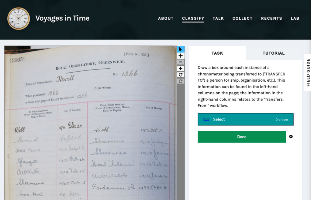 A substantial amount of work has already been undertaken by Dorothy Mellor, a volunteer at Royal Museums Greenwich, to convert these scanned images into structured data. Her database provides a solid foundation for our crowdsourcing project and has enabled us to take a more minimal approach that seeks to capture only specific sections of the ledger pages rather than the full contents. Throughout the development of the Zooniverse project, we have collaborated with Emily Akkermans, Curator of Time at Royal Museums Greenwich, who has played a key role in shaping the project and has provided crucial insights into the ledgers themselves, as well as the chronometers they describe.